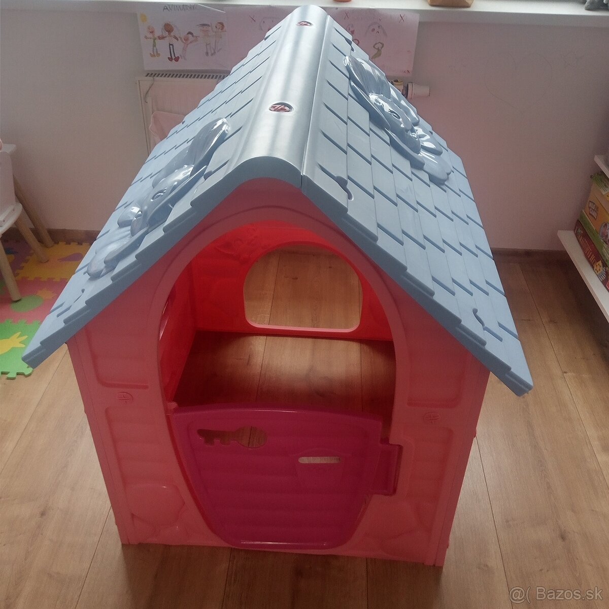 Predám dievčenský ružový plastový domček po jednom dieťati, je v úplnom poriadku, jedine v zadnej časti striešky je malá prasklina, ktorá nijako nevplýva na funkčnosť domčeka (viď foto), je tam od nova, ale keďže to nerobilo problém a ani to nebolo vidno tak sme to neriešili.