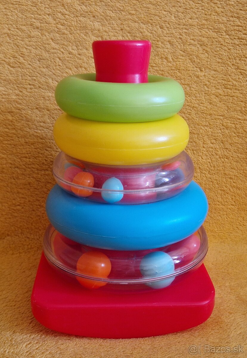 Pyramídka s piatimi krúžkami, v dvoch sú guličky, môže poslúžiť ako hrkálka. Kupované v Tescu. Vo výbornom stave.