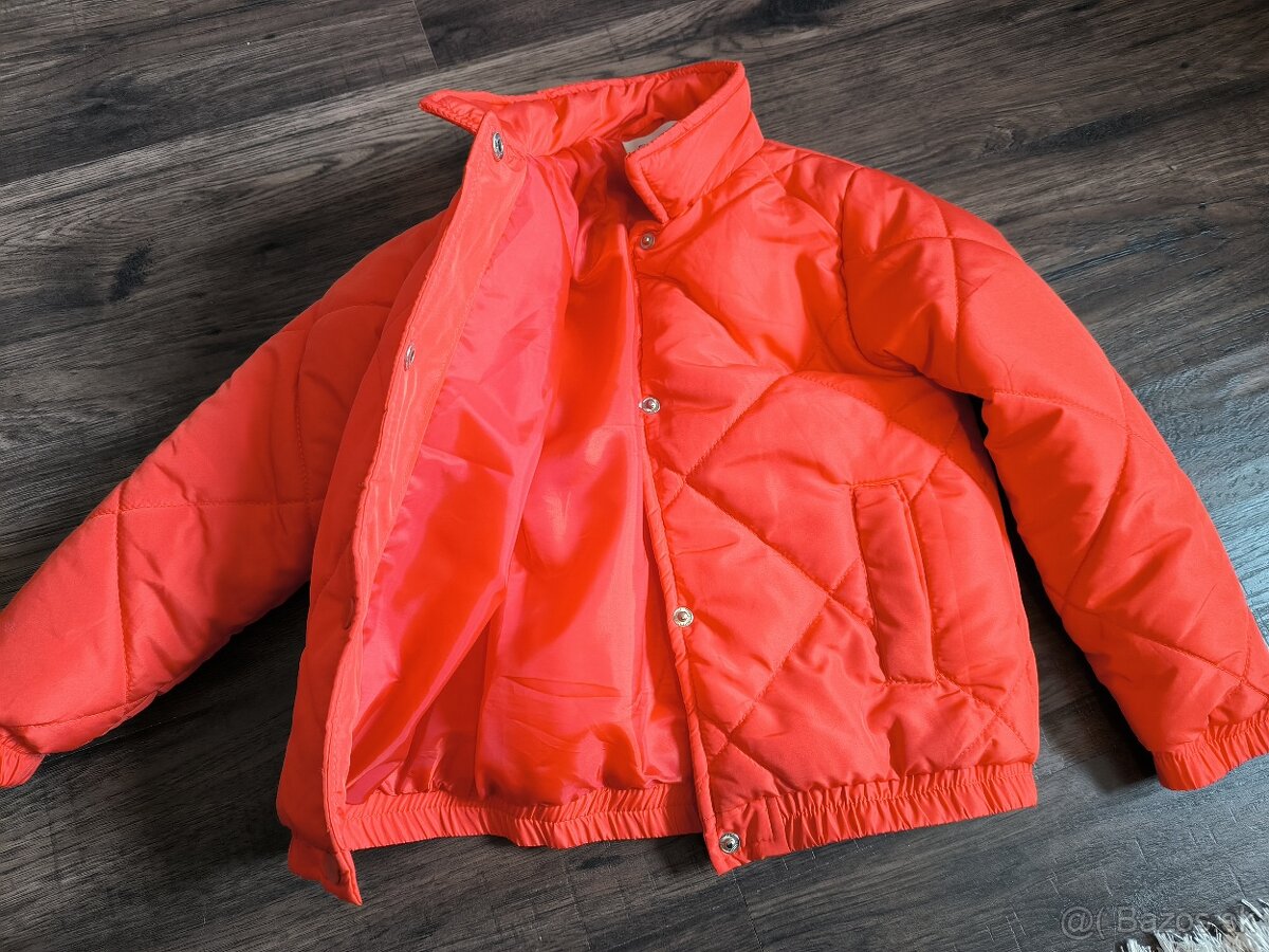 Predám dievčenskú bomberu/prechodovy kabátik vo veľkosti 116. Oranžová farba, zapínanie na gombíky, reflexný prvok vzadu, málo nosené. Cena 7€..