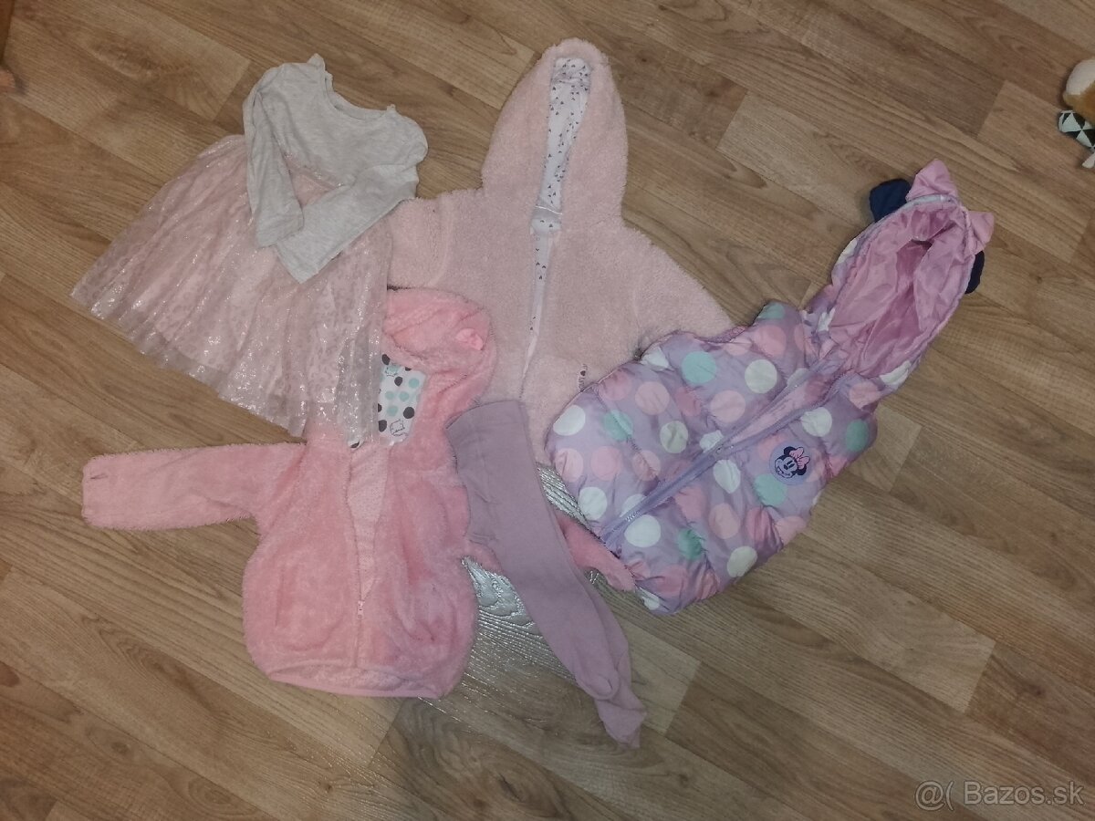 Oblečenie je vo veľkosti 74. Balenie obsahuje zimný kabátik, vestu, šaty s dlhým rukávom, mikinku a pančušky.
