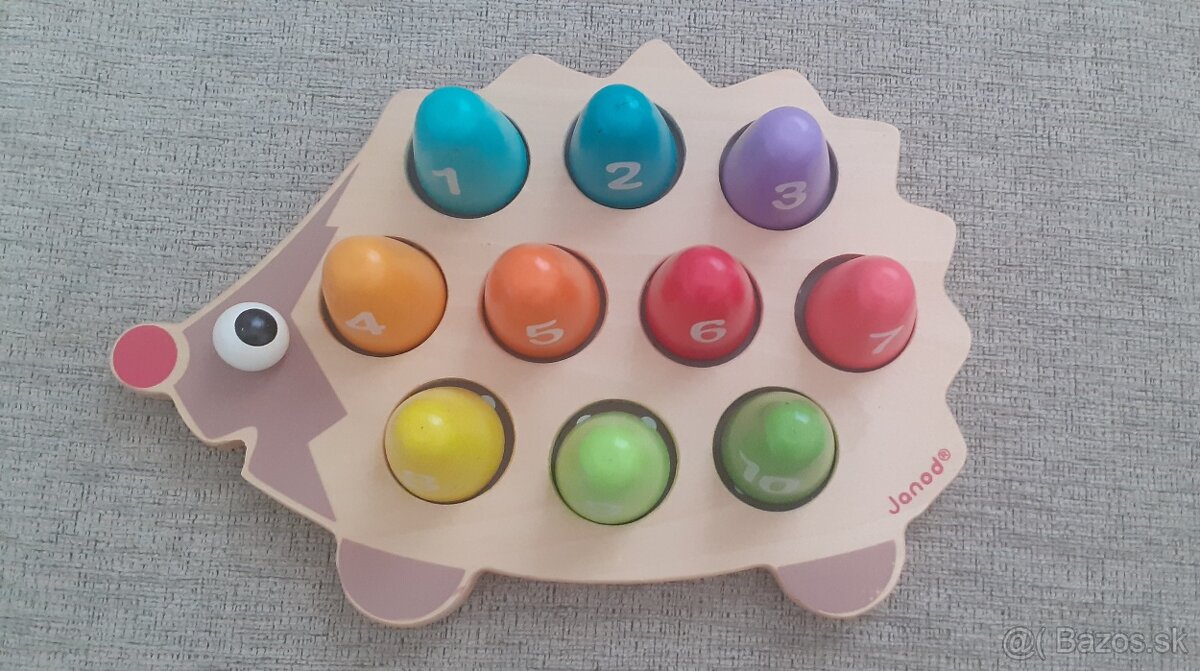 Drevená vkladačka ježko učíme sa počítať. Pod každým tvarom s číslicou je počet bodiek zodpovedajúcich číslu. Dieťa si rozvýja jemnú motoriku, učí sa tvary, farby a čísla. Značka Janod.