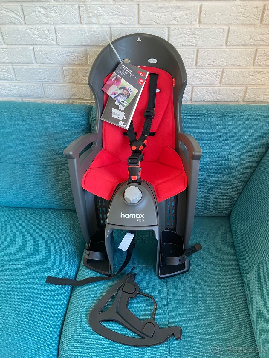 Predám cyklosedačku Hamax SIESTA s prichytením na zadný nosič na bicykel (carrier adapter). Na bicykle veľkosti 26", 27,5", 28" a 29", rozsah upevnenia: 28 – 40 mm, nosnosť 22 kg. Polohovateľné operadlo s výškovým nastavením a možnosťou sklopenia o 20°. Predávam spolu s krytými opierkami nôh.