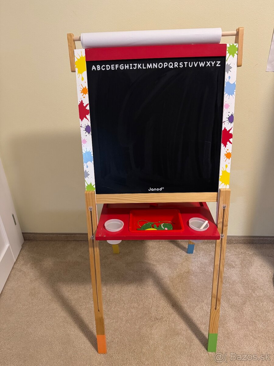 Drevená obojstranná magnetická výškovo nastaviteľná tabuľa, z jednej strany klasická čierna na kriedy a z druhej strany magnetická biela tabuľa, s množstvom užitočných doplnkov, vďaka ktorým zaujme a zabaví každé dieťa na veľmi dlhý čas. Na vrchnej časti tabule je papier na kreslenie v odvíjateľnej rolke.