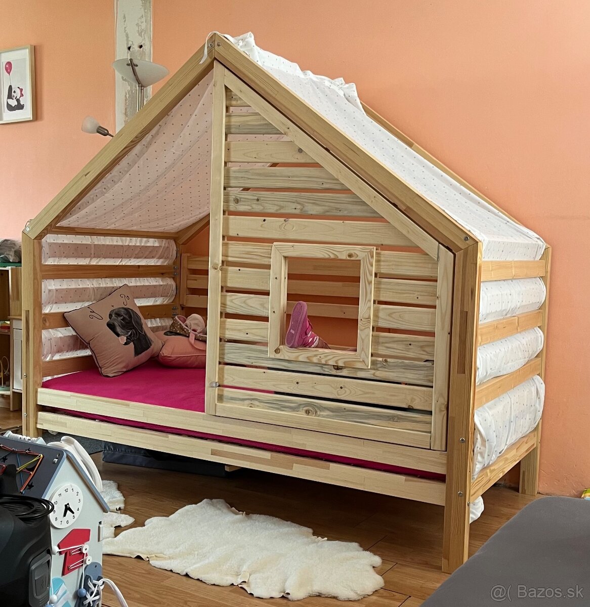 Predám používanú na všetko iné len nie na spanie domčekovú postieľku s baldachýnom aj s matracom a plachtami(ružová, Modra). Ma dve verzie len so zábradlím alebo polka vyplnená “stenou” s oknom, ktorá mala u nás väčší úspech.