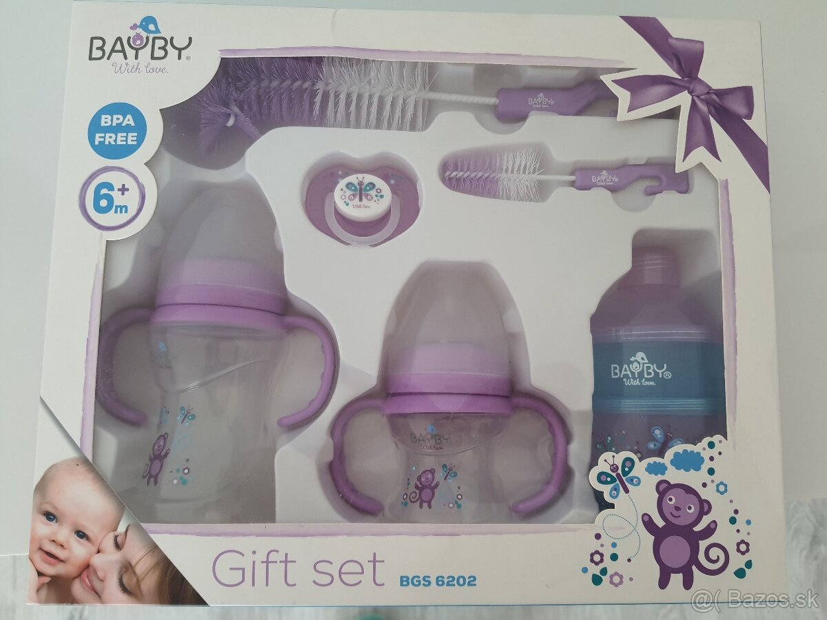 Predám darčekový set na obrázku Baby with love. Set obsahuje 3 fľašky,cumeľ a sadu na čistenie. Vhodný od 6 mesiacov. Úplne nový, nerozbalený. Možný aj osobný odber. Cena 20e