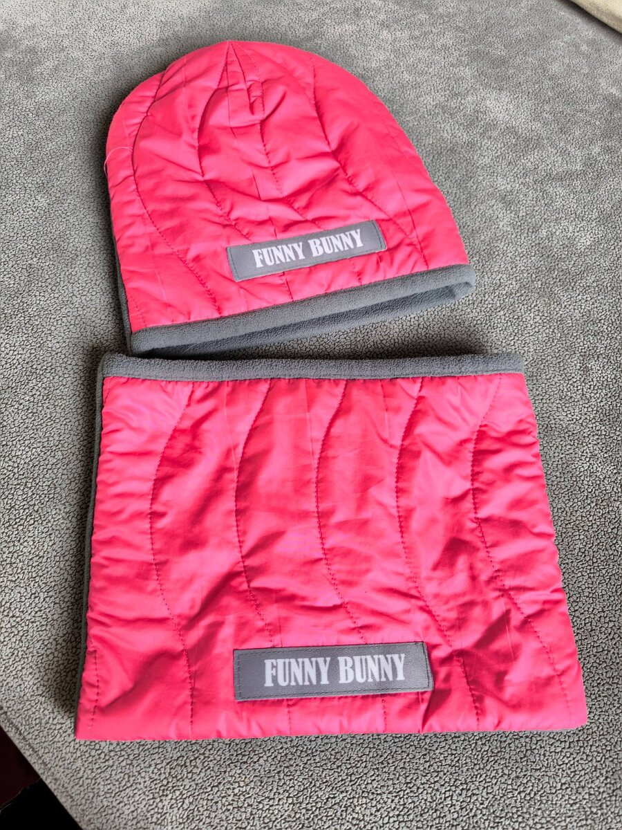 Krásna pískacia čiapočka a nákrčník slovenskej značky Funny Bunny. Väčšia veľkosť. Môže sadnúť cca. pri veľkostiach 104, 110, 116, 122, 128, 134 - záleží na obvode hlavičky....my sme ponosili dlhšie ...rozmery sú pri fotkách