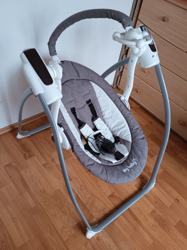 Predám detskú elektrickú hojdačku/kolísku My Baby Wipe Swing NA81 v šedo/bielom prevedení. Viaceré úrovne rýchlostí hojdania, množstvo melódií, nastavovanie hlasitosti/úplne stlmenie. Dodám s originálnym napájacím adaptérom do elektriky ( neriešite výmenu batérií ). Kolíska je používaná, ale veľmi zachovalá a čistá. Cena 60€. Brestovany, okres Trnava. Kontaktujte ma len telefonicky, SMS neodpoviem.