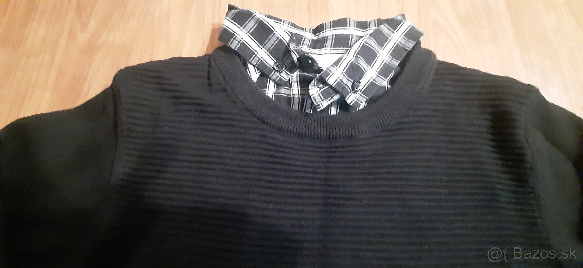 Pekný, prúžkovaný, čierny sveter s košeľovou podšívkou. Chrbát hladký. Veľmi dobrý stav, žiadna vada. Kuk na moje inzeráty.
