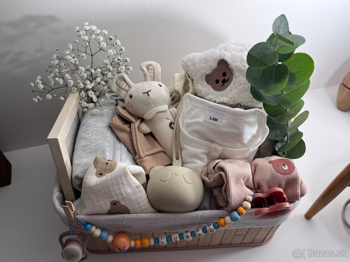bambusový box 33x13x23, veľká deka 100x75, malá látková “plienka” 25x25, hračka-hrkálka, dudlík, box na dudlík, podbradník, fotorámik, plienky veľ.2 (celé balenie-24ks), vlhčené obrúsky, 2x dupačky veľ. 68, čiapočka, rukavice, samozrejme meno na retiazke k dudlíku, podľa požiadavky.