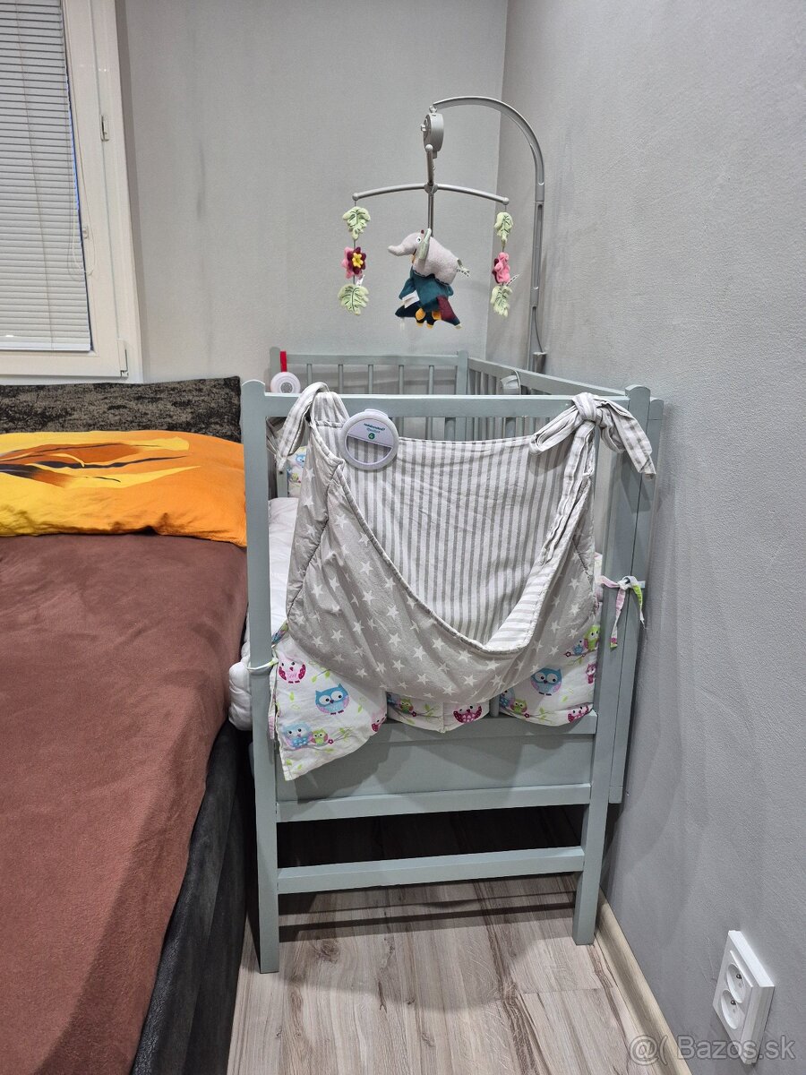 Funkčná retro postielka drevená, pridáme plachty, aj nové a všetko ako je na foto. 3 polohy výšky, matrac neprecikaný, bol na nom stále nepremok, vak na blbosti, mäkký okraj, všetko opraté. Postielka bola natretá nezávadnou farbou. Pridám aj tú zvonkohru a zvieratká
