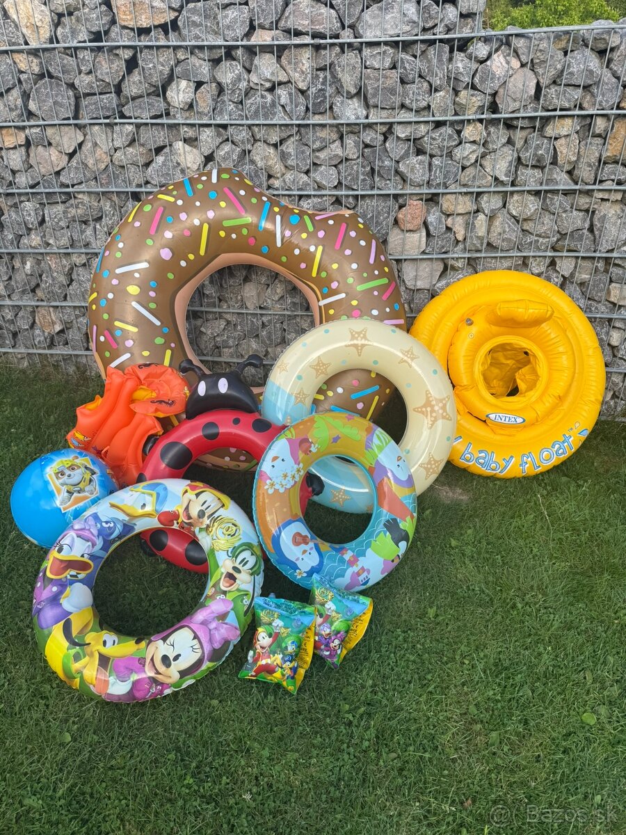 plávacie potreby na kúpanie - nafukovacie kolesá - rôzne veľkosti, plávacia vesta, rukávniky, nafukovacia lopta, suma za všetko spolu. Najmenšie kolesá majú vnútorný priemer cca 18-20cm. V ponuke aj detské koleso vhodné pre 6-12 mesiacov - suma 9€