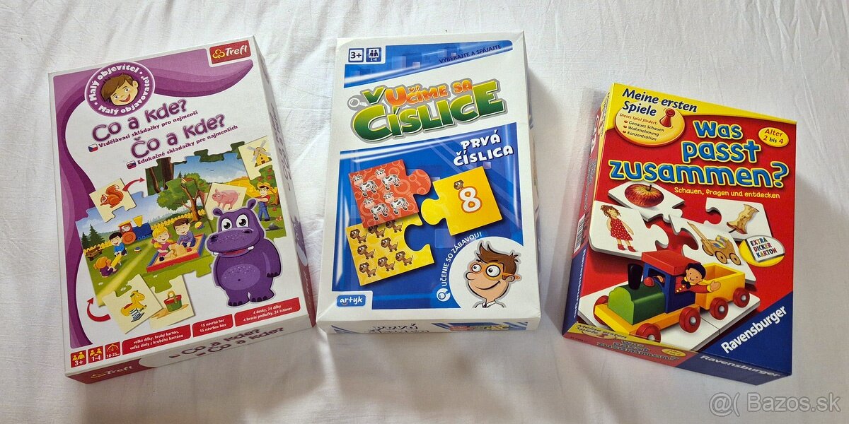 Predám 3 edukačné hry: Co a kde / Čo a kde; Učíme sa číslice; Hra Ravensburger Čo sa k sebe hodí?; vo výbornom stave, na krabiciach zvnútra sú nejaké čmáranice, hádam to nevadí, nič nechýba, cena je pevná.