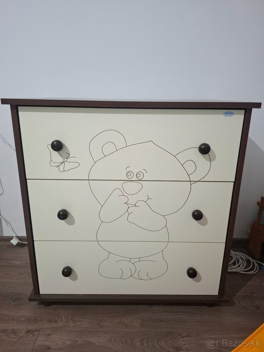 Predám kompletnú zostavu detského nábytku značky Drewex.Vrátane prebalovacieho pultu a podložky. Bežné známky používania. K postieľke je aj matrac. Nábytok je zložený.