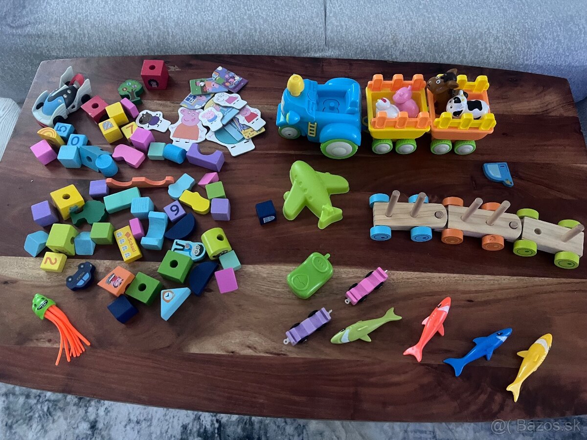 Farmársky traktor-zvieratká vydávajú zvuky a traktor prehráva melódiu (chyba figúrka farmarika),balik obsahuje veľa drobných hračiek - kartičky Pepa pig, drevene autíčka atd-vid foto.Osobny odber Kvetoslavov alebo posta/packeta