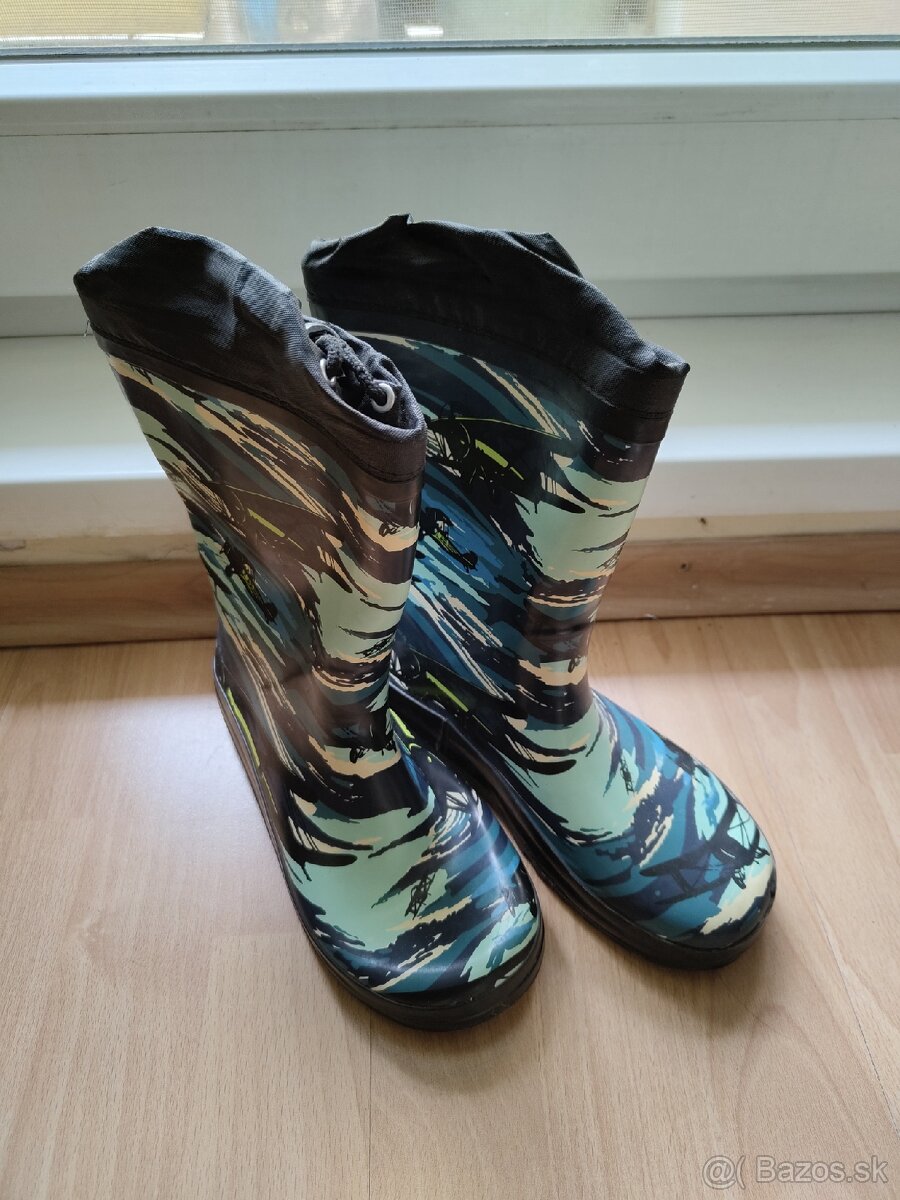Predám pekné detské gumáky vo veľkosti 34. Majú moderný modro-čierno-zelený vzor.