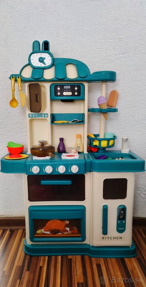 Detská kuchynka + príslušenstvo, nepoužívaná . Rádio hrá na baterky . Pumpička na vodu.Horáky svietia , zvuk , imitácia pary. 15 €