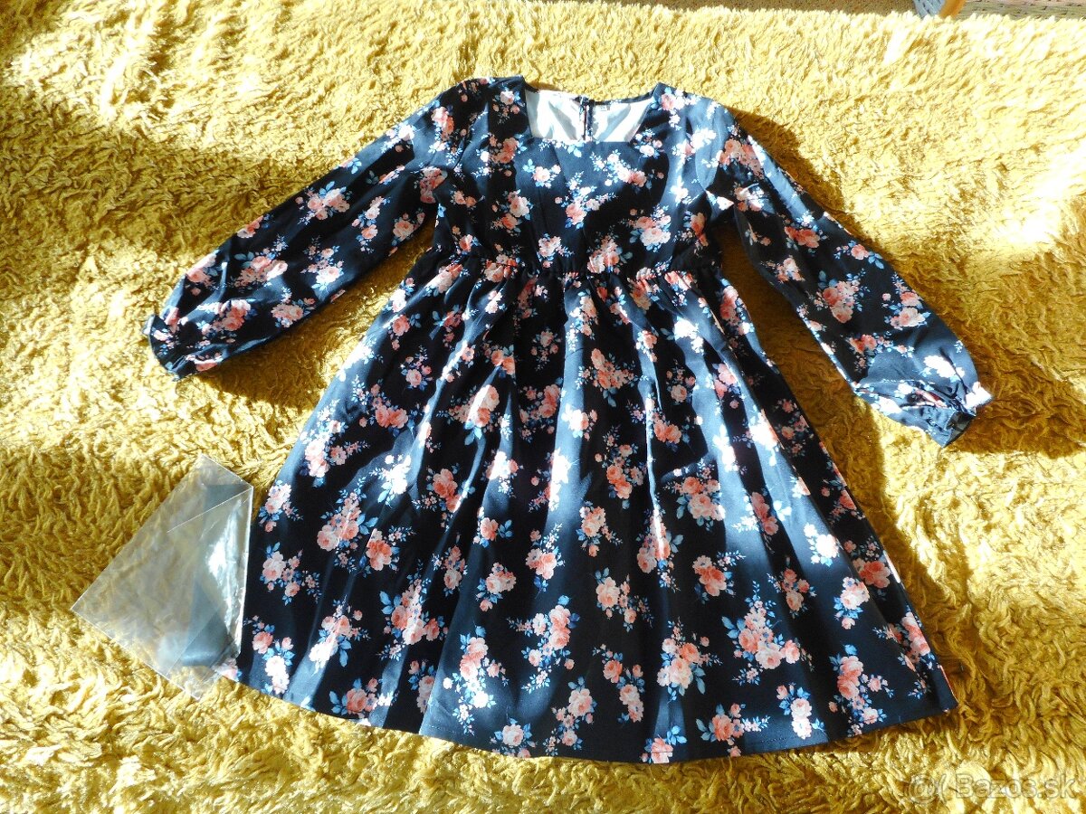 predám nové nikdy nepoužité len vyskúšané nesadla veľkosť krásne tenšie šaty na príležitosti boli kupované na výšku 146cm, ale reálne sú menšie, je na nich štítok veľkosť 130cm čo šatom nezodpovedá, môj odhad je veľkosť 128-134cm, čiernej farby s potlačou veľmi pekných kvetov s dlhým rukávom ukončeným gumičkou s hranatým výstrihom s gumičkovým pásom ku ktorému je zvlášť ozdobná mašľa na previazanie okolo pása, je potrebné sa orientovať podľa týchto meraní, celková dĺžka šiat je 71cm, pás gumičkový v kľude 32cm, ešte sa kúsok natiahne, šírka pod pazuchami je 36cm, dĺžka šiat hore od ramena po gumičkový pás je 27cm, od pása dolu je dĺžka 47cm, vonkajšia dĺžka rukávu od šitia ramena je 45cm, vnútorná dlžka je 34cm , látka je pevná, bez možnosti natiahnutia, šatočky bez podšívky, vzadu zapínanie na krku na jeden gombíček