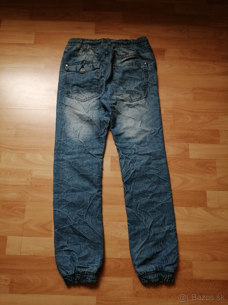 Predám rifle veľ. 164, pokrčeného vzhľadu, v pase guma a šnúrka. Celková dĺžka je 102 cm, pás v klude 37x2 cm.
