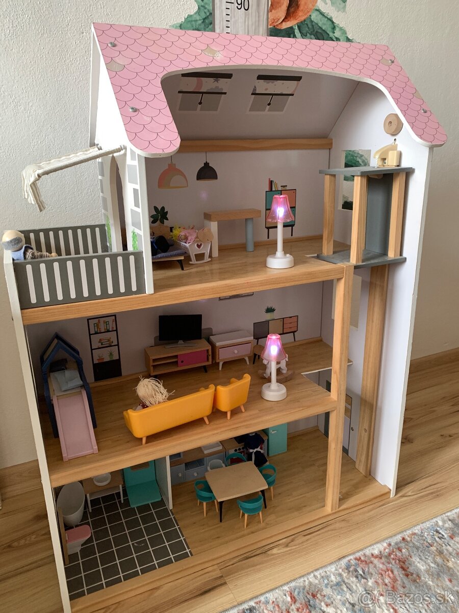 Predám hraný domček pre bábiky . Je vhodný na skúšku či to dieťa bude baviť. Všetko je v ňom funkčne . Výťah na šnúrku, 2x svietiace lampičky a postavičky . Strecha bola opravená . Nič sa nerozpadava. Ma známky hrania na sebe .