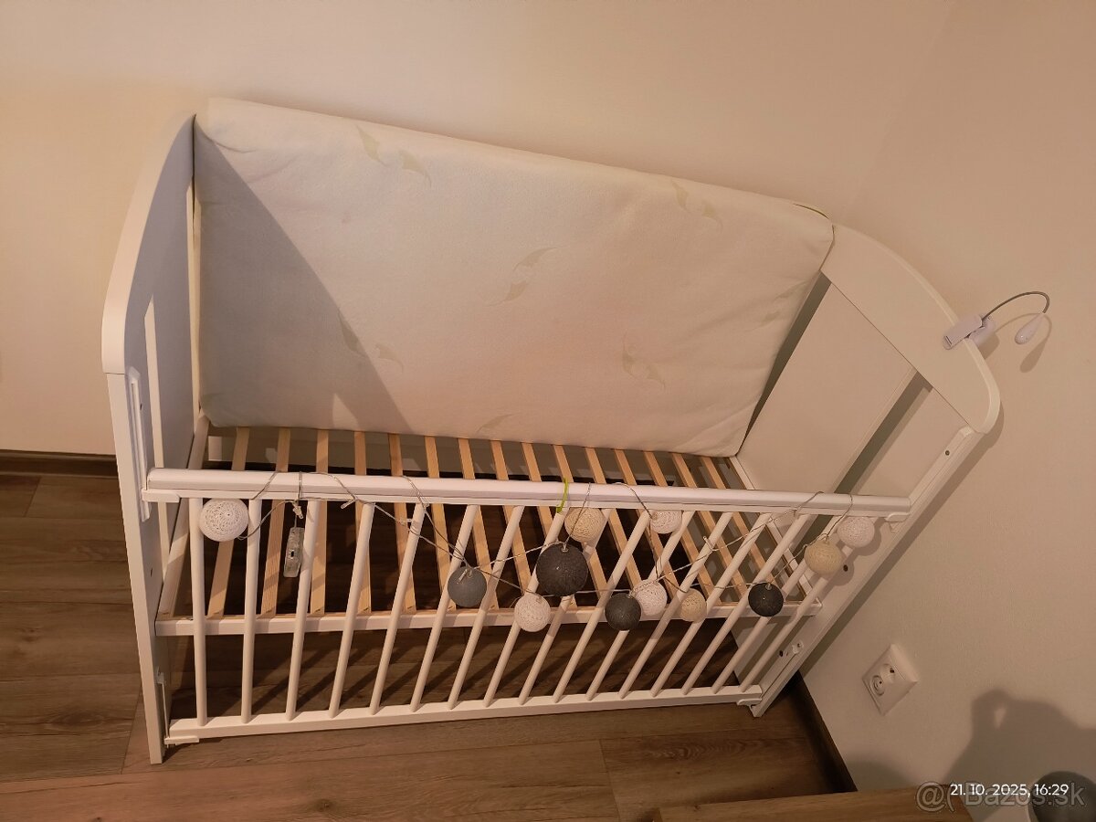 Predám postieľku, ktorú sme mali pripravenú pre bábätko ale nespinkala v nej. Predám spolu s matracom + 50€ (nepoužívaný). Pribalím aj 2x plachtu, z toho jedna nepremokavá (biela, ružová). Jedna chyba je, že bočnica padá už odkedy sme postieľku zmontovali, výrobná chyba. Je možnosť podložiť bočnicu drievkami, tiež pribalím-viď foto.