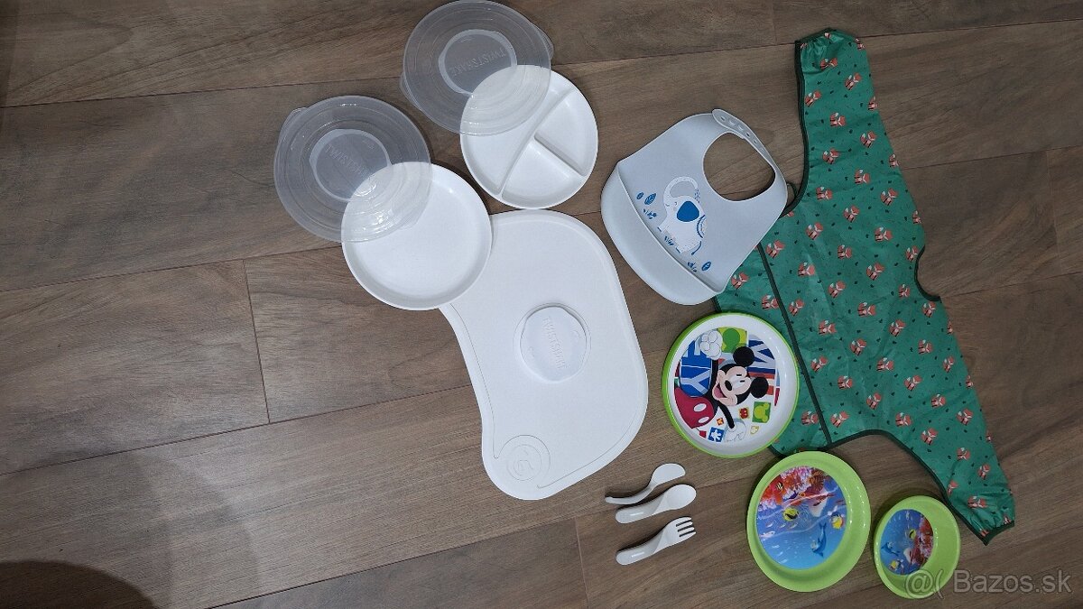 Twistshake s dvomi taniermi a podlozkou + príbor pre dieťa začínajúce papať samostatne. Pribalím 2 podbradniky a 3 tanieriky