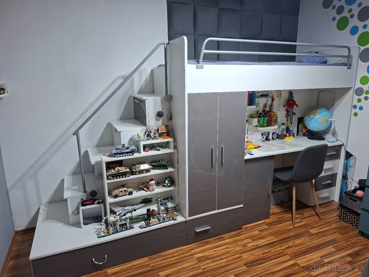 Naozaj praktická, pekná posteľ, používaná 3 roky, kopec úložného priestoru-aj v schodoch, mini chybičky krásy zohľadnené v cene.