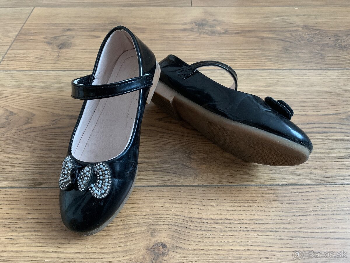 Predám dievčenské lesklé čierne balerínky (topánky) s bielymi korálikovými mašličkami.