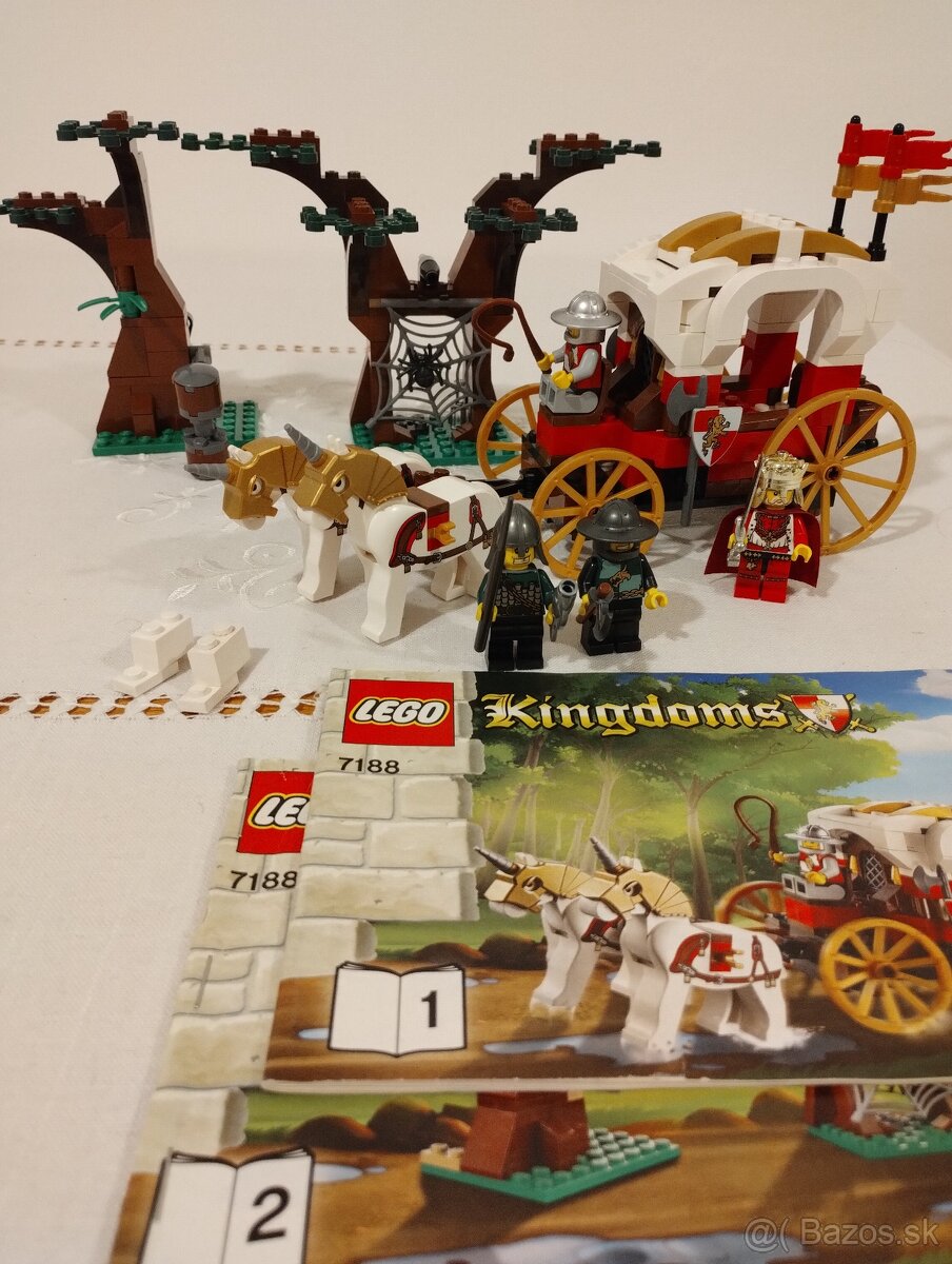 kompletné LEGO 7188 King's Carriage Ambush z kolekcie Kingdoms z roku 2011, s originálnym návodom, kocky bez poškodenia. 4 figúrky, z toho 3 unikátne (CAS487, CAS485 a CAS498) použité výlučne v tomto jedinom sete. stavebnica bez zápachu, z nefajčiarskej domácnosti bez domácich miláčikov.