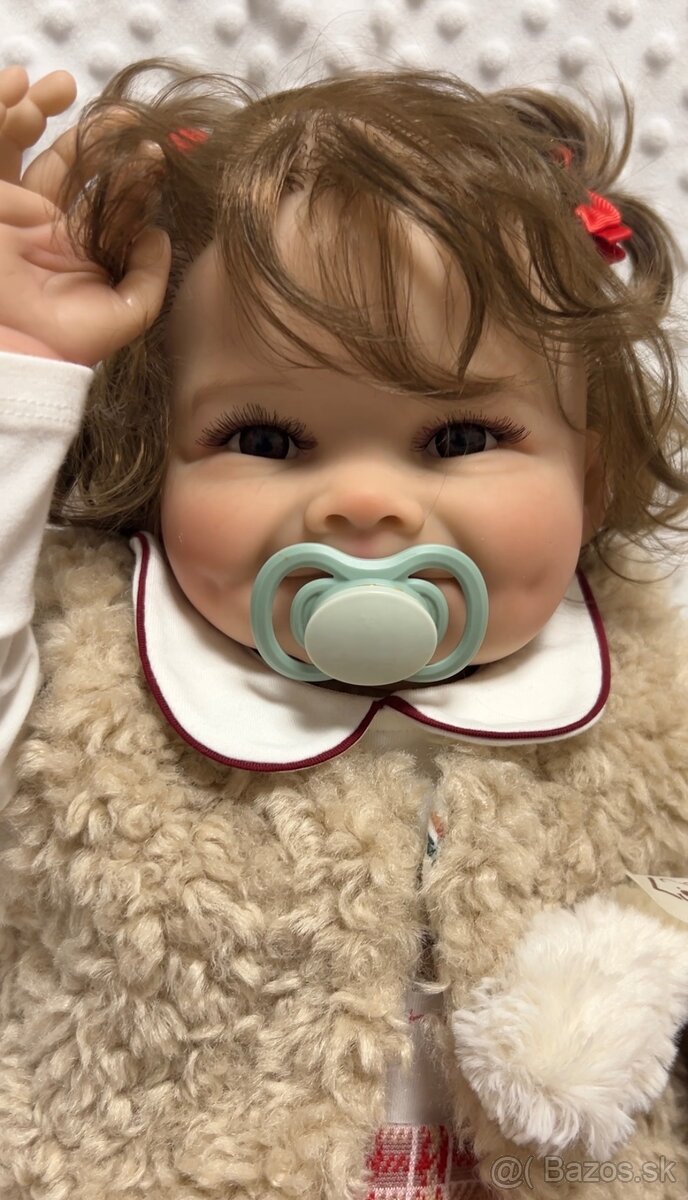 Bábika meria 60 cm , má látkové telo, ruky a nohy sú z vinylu . Dievčatko má hnedé očká s mihalničkami , vpichované vlásky , dudlik na magnet . Pošlem ju oblečenú ako na fotke .