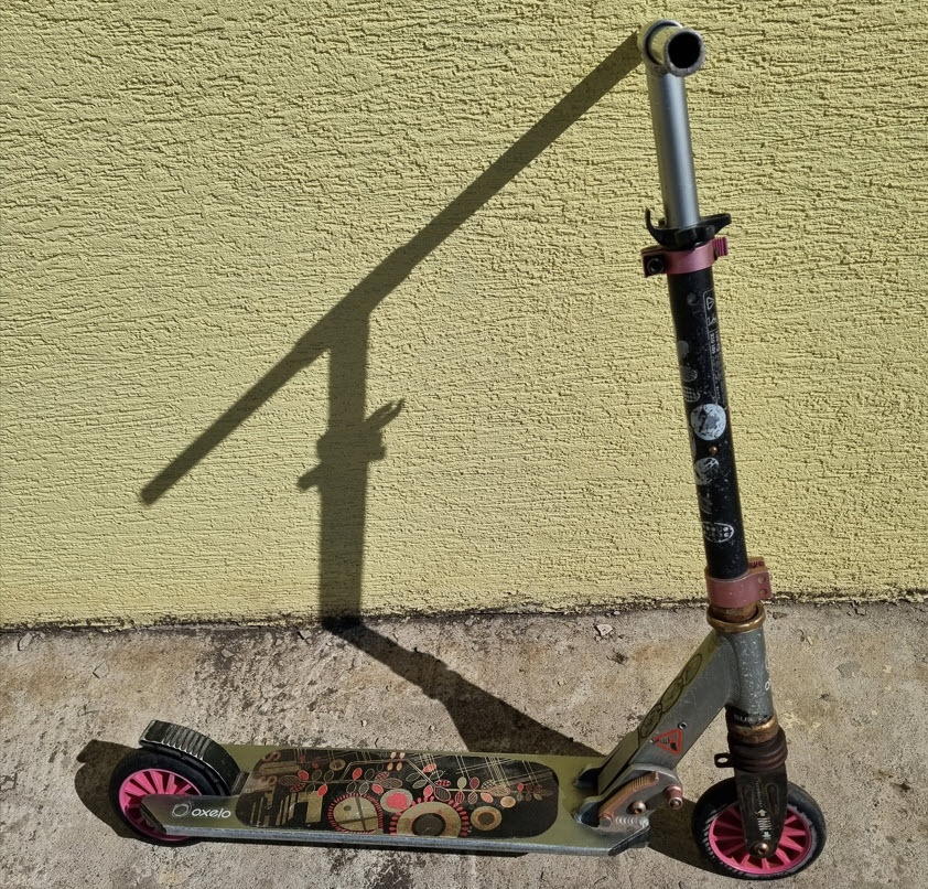 Predám detskú hlinikovú kolobežku s dievčenským motívom s možnosťou nastaviť výšku riadidiel a sklopiť pre lepšie skladovanie.