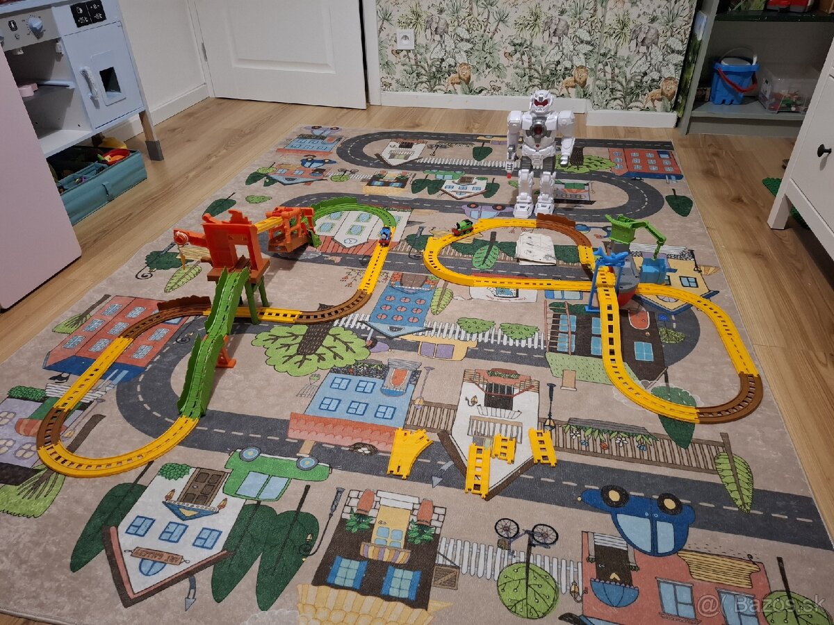 Predam kolajnice v dobrom stave z plastu, k tomu dva vlaciky Tomas a Percy a ešte ako bonus kracajuci robot