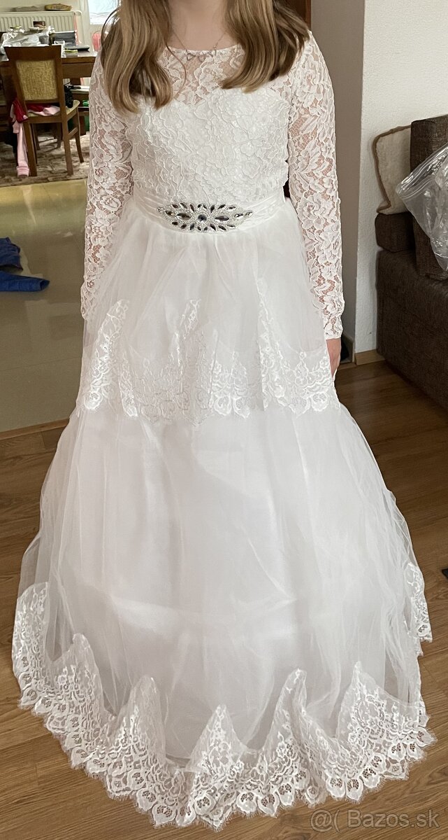 Šaty na 1. sv. príjímanie, 1x oblečené. Na vyššie dievčatko, regulovaťeľné v páse. V šatách je 1 kruh, pridávam spodničku s 3 kruhmi. Po dohode doveziem.