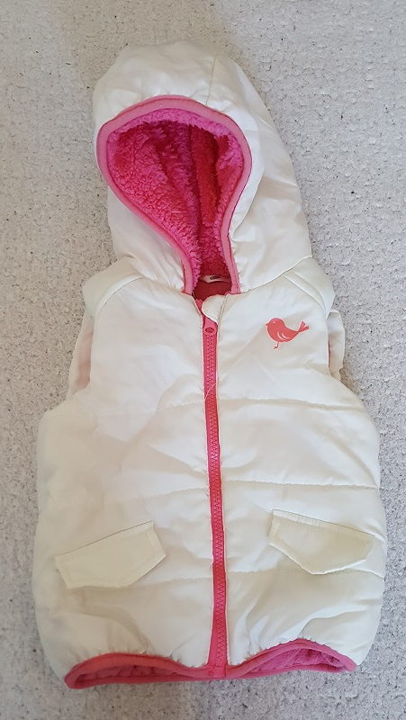 Predám dievčenskú vestu bielej farby, podšívka ružovej farby. Veľkosť 74, kupovaná v Pepco.