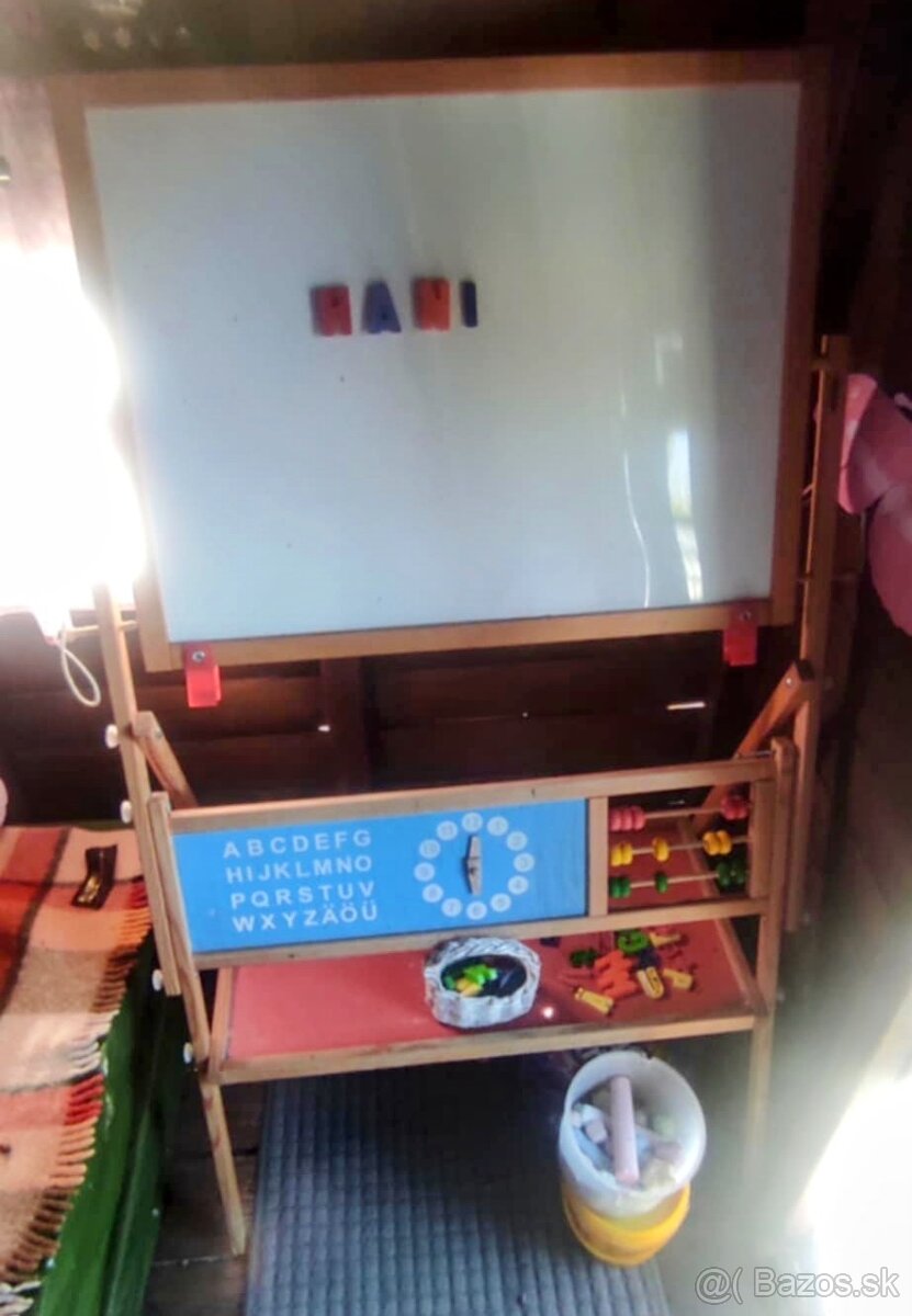 Obojstranná tabuľa pre deti. Jedna strana magnetická, na ktorú sa dá kresliť, písať aj s fixkami. + Aj s magnetkami čísla a písmená. Druhá strana vhodná na kreslenie s kriedami. V peknom zachovalom stave.