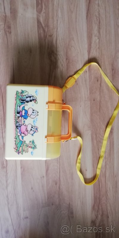 Predám detský kufrík žltej farby, ktorý obsahuje plastový príbor, fľašku na pitie, a box na jedlo.