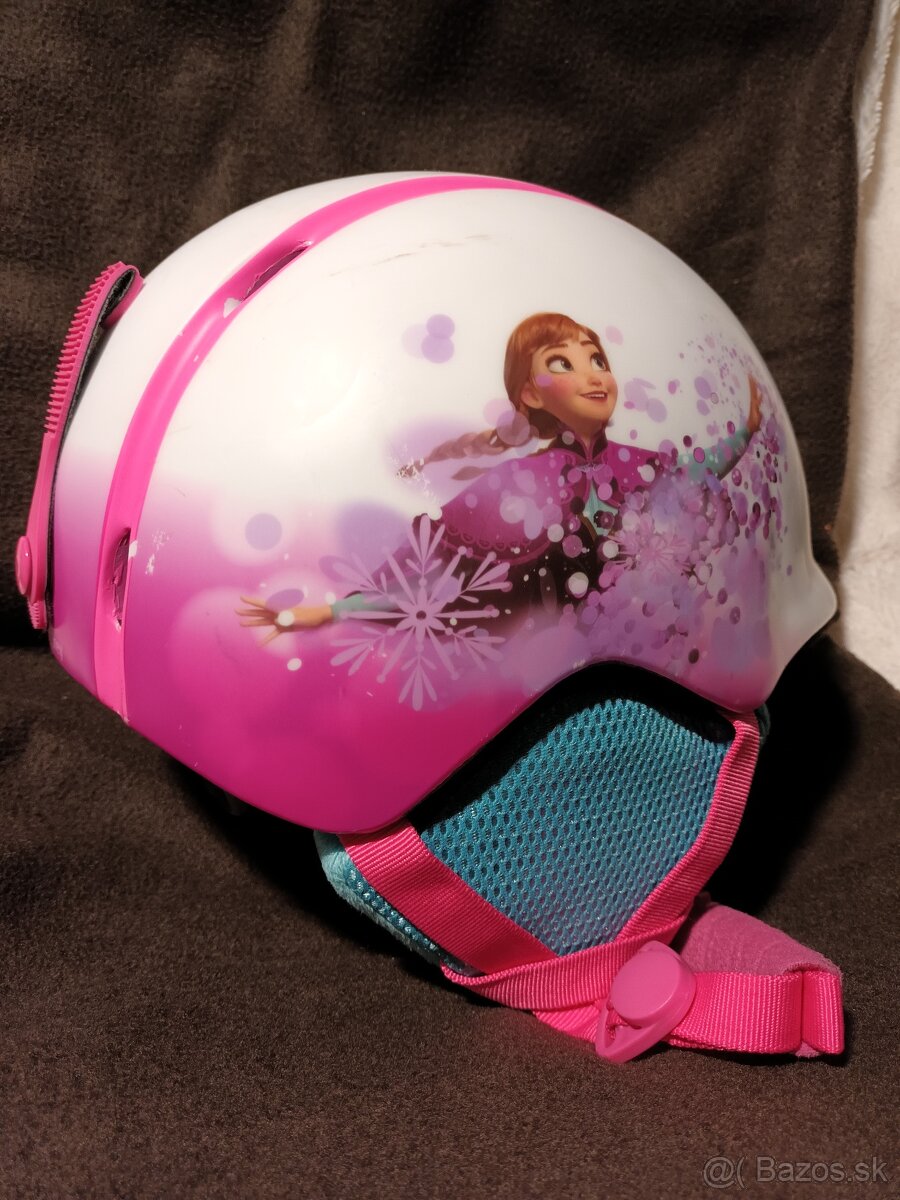 Posunieme ďalej krásnu, dievčenskú skoro ako novú zimnú helmu "Ľadové kráľovstvo", velkosť 51 - 54 cm. Využitá na lyžovačke i korčuľovaní dve sezóny, bez akýchkoľvek poškodení. Oblasť uší chránená mäkkučkým polstrovaním. Tvar predného priezoru umožňuje dokúpiť lyžiarske okuliare bežného tvaru.