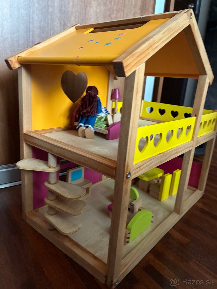 Bábiky a panáčkovia môžu konečne bývať pohodlne. Veľký drevený domček pre bábiky je vkusnou hračkou, ktorá Vaše dieťa neomrzí. Domček pre bábiky má terasu a obsahuje 14 dielov príslušenstva (3 bábiky a nábytok).