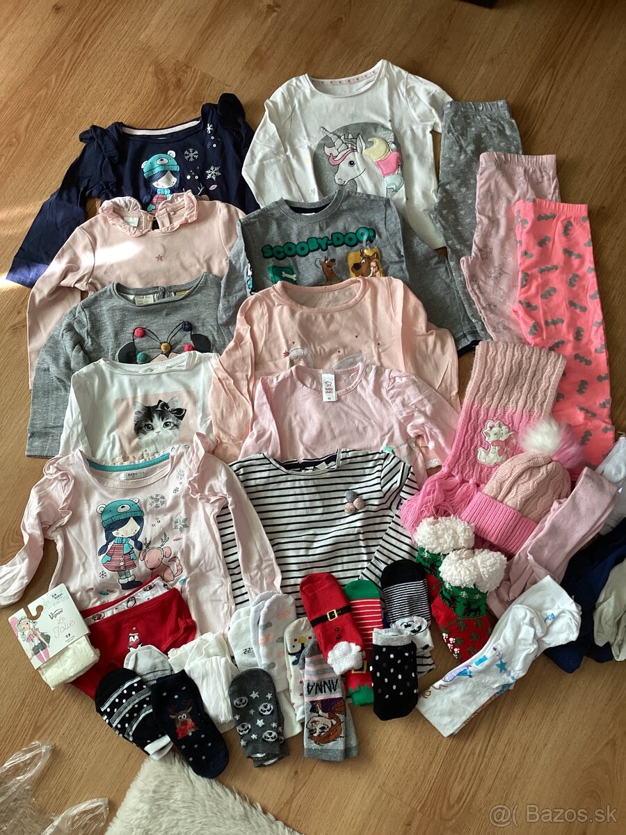 Sukna, saty, mikinove saty, 2x svetrik, komplet pyzamko, rifle, 2x nohavice, 4x tricko dlhy rukav, tricko kratky rukav. Mix znaciek: H&M, Next, Primigi, DopoDopo,… Vecicky su minimalne nosene, niektore vobec.