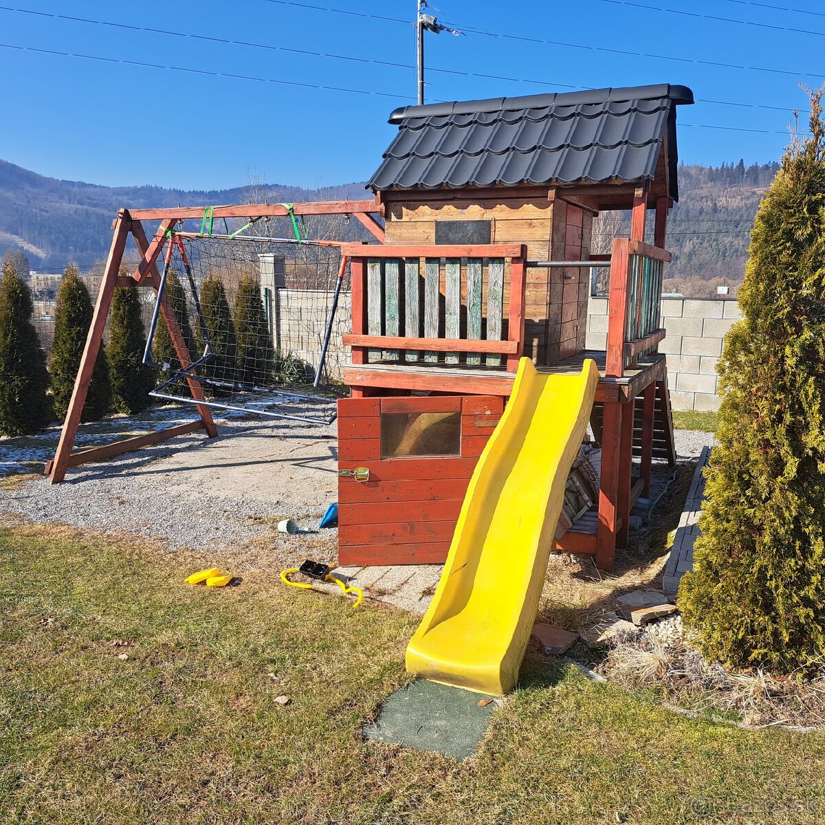 Predám detský domček so šmýkľavkou a dvojitou hojdačkou. Dole má garáž, hore je jedna miestnosť s dvomi oknami, jedno otvaráteľné, balkón. Žrď na vlajku. 2x hojdačka, v cene aj bocianie hniezdo. Výlez je riešený lezeckou stenou. Dohoda na cene možná. Doprava a montáž, podľa dohody.