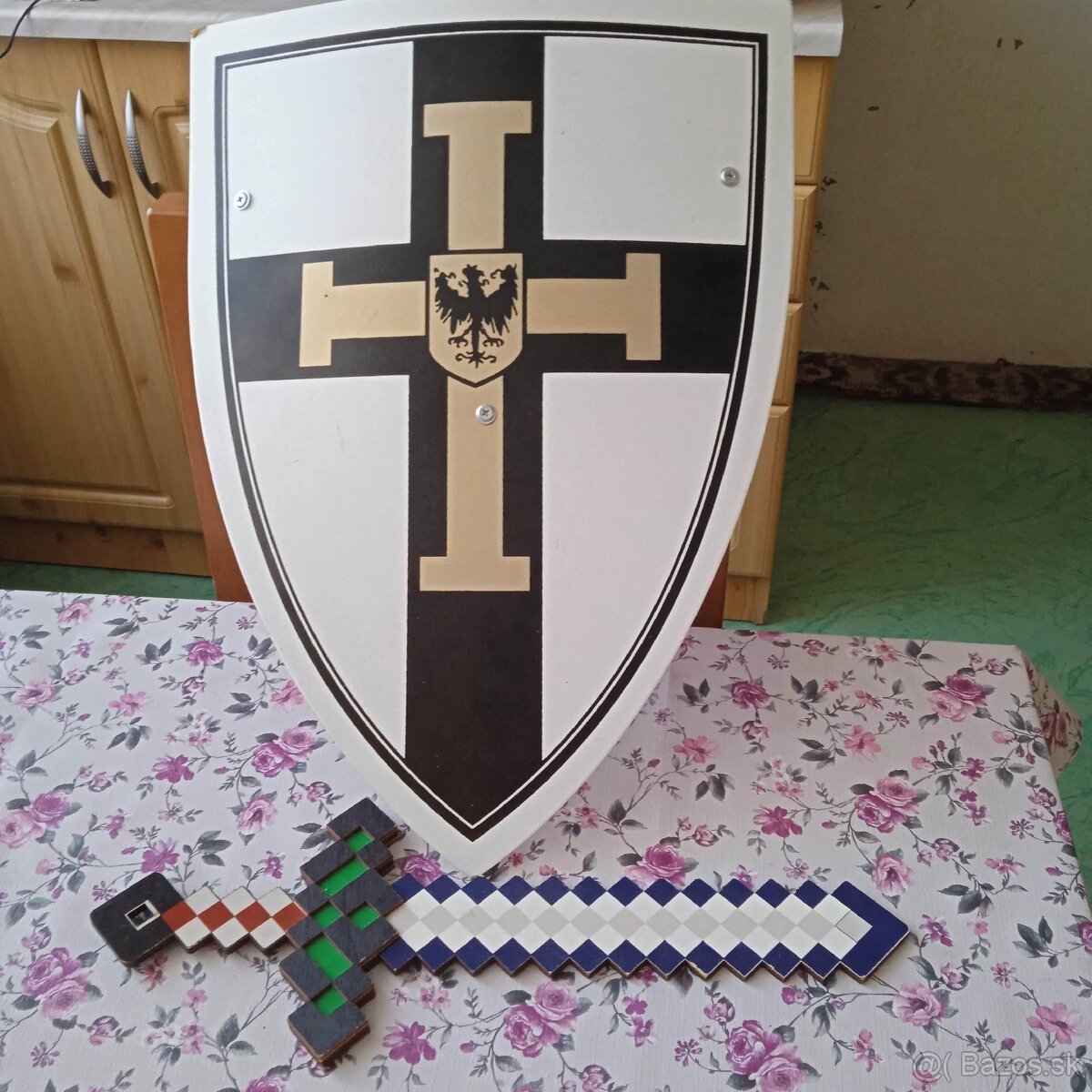 Dobrý deň,predávam Meč+štít len spolu,su ako nové,Meč má dlžku-38x13cm,štít má dlžku-45x33cm,všetko je drevené s znakom Orlice na štíte,cena-10+3,90eur s poštovným a balným,platí sa vopred na moje číslo učtu alebo predám osobne.