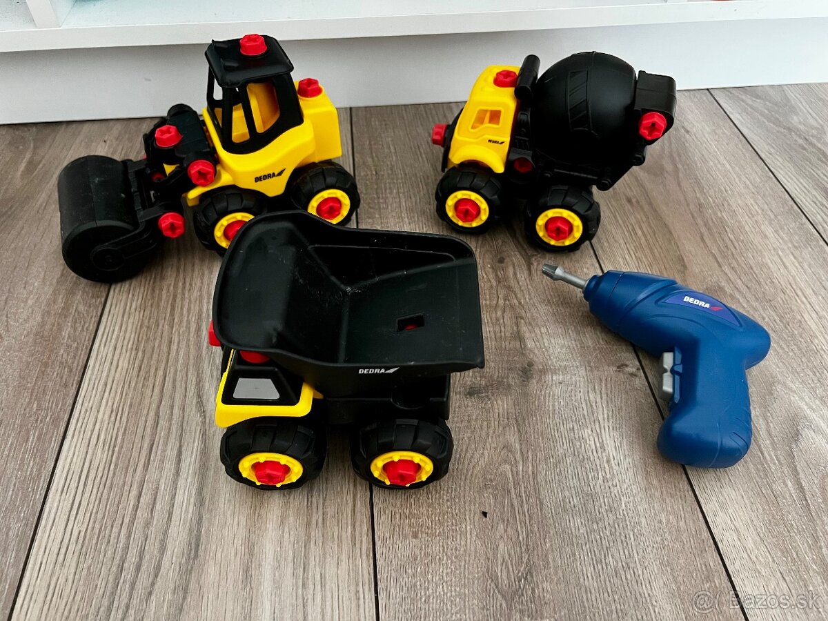 Predám 3 ks detských stavebných áut DEDRA (valec, miešačka, sklápač) + detská uťahovačka na skrutky.