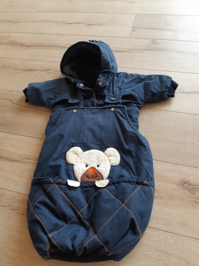 fusak Babynest, Germany, 2v1, do sedačky bunda + spodný diel , zapinanie na cvoky, bunda dl 35, pevna kapucna, spodný diel s aplikaciou macka a velkým klokaním vačkom, dl 46, š 40, zateplné, vzadu otvor na bezp. Pas,