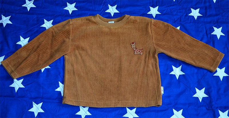 1. Hnedy pulover alebo tensi sveter so zirafou zn. Antony, vel. 80 (9-12 mes.). Material nieco ako velur. 82% bavlna, 18% polyester. Noseny, v dobrom stave, poskodenia som nenasla. Celkova dlzka 34,5cm; sirka pod pazuchami 2x33,5cm; dlzka rukava od krku 37cm, od ramena 29cm. Cena 2€ + posta (vaha do 500g).