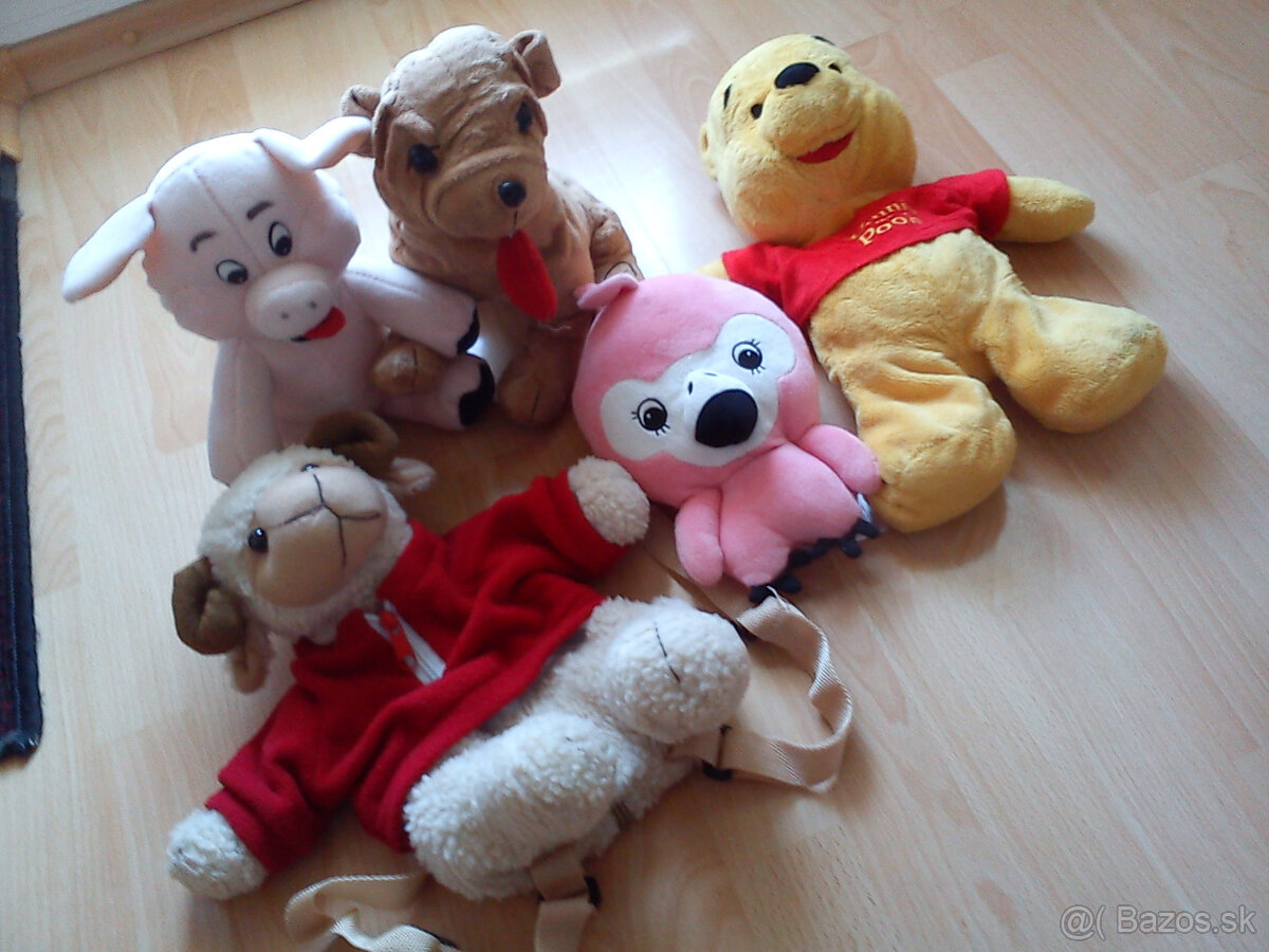 predám hračky macko PU, prasiatko, psík, vtáčik, ruksak ovečka 31 cm, cena za 5 ks 10,- eur