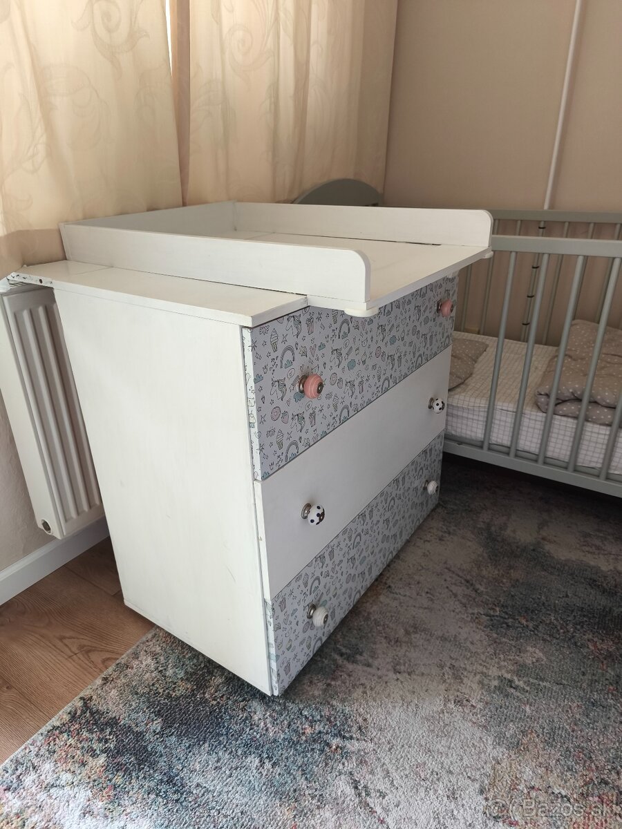 Predam prebalovaciu komodu s pultikom na prebalenie. Je to nami prerobena a pouzivana komoda. Prerabka komody zahrna premalovanie komody kriedovou bielou farbou, nalepenie tapety na 2 sufliky, 6 novych uchytiek na sufliky, 1x plastovy bezpecnostny zamokikea na horny suflik, 2x plastove chranice ikea na ostre rohy prebalovacej casti, vid foto.