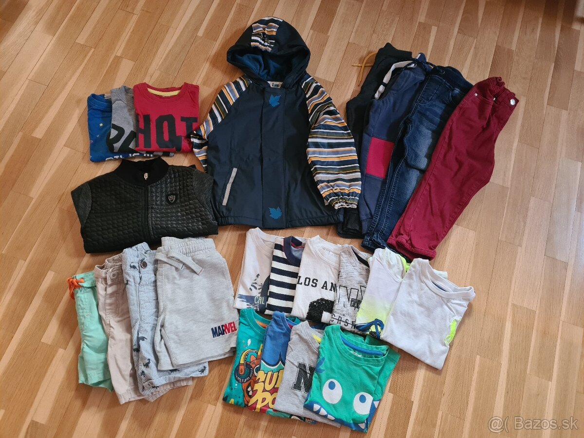 Chlapčenské oblečenie veľ.122 - [27.12. 2025]Ponúkam na predaj chlapčenské oblečenie veľ. 122. V balíku sú 2 prechodné bundy, 2x marvel pyžamo (kratasy, krátke tričká), sveter, mikina, 5x tričko s dlhým, 7x tričko s krátkym rukávom, 2x kratasy, 2x rifle, 3x tepláky, obojstranná vesta