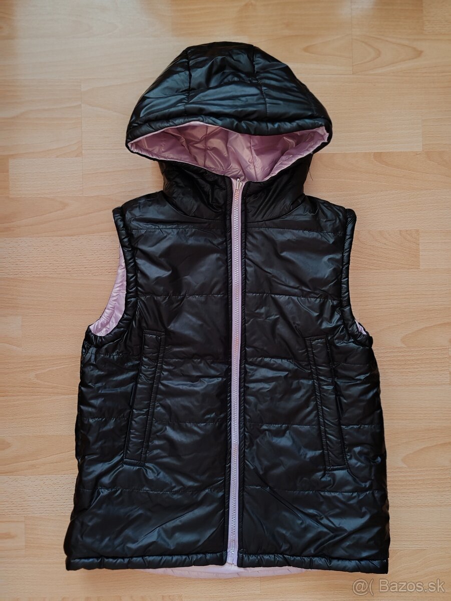Predám dievcensku obojstrannú vestu, veľ. 164,farba ruzova/čierna. 1x použitá.