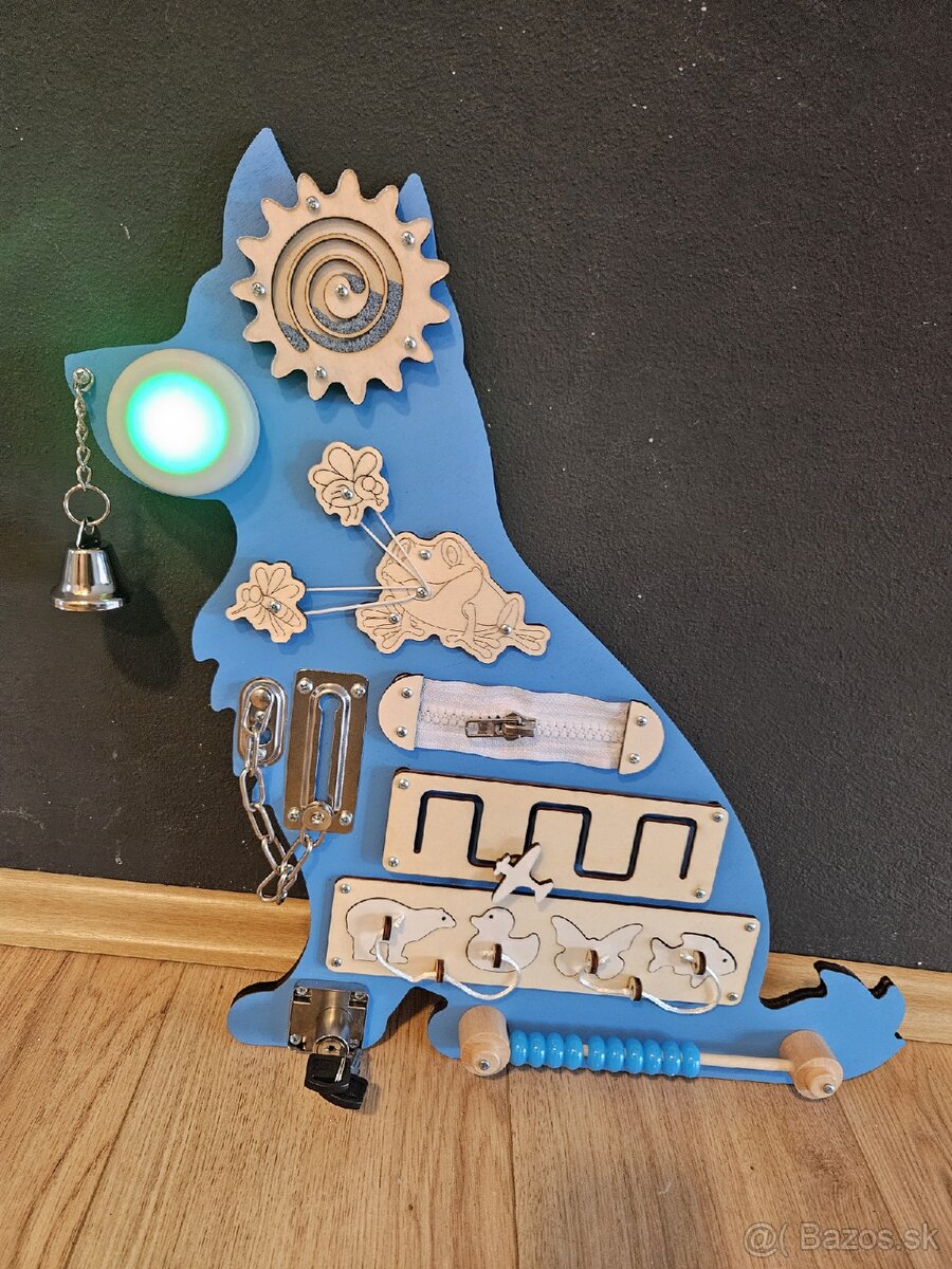 Predám aktivity board drevenu interaktivnu edukacnu tabulu psika 40x60cm, vyrobené z ľahkej drevenej preglejky, možne menit farbu podľa požiadavky.