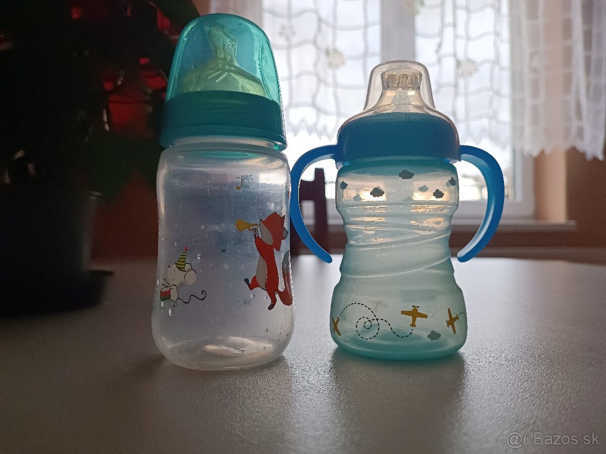 Detská fľaša s náustkom a bočnými držadlami, objem cca 250ml. Mäkký silikónový náustok s ochranou proti úniku tekutiny
