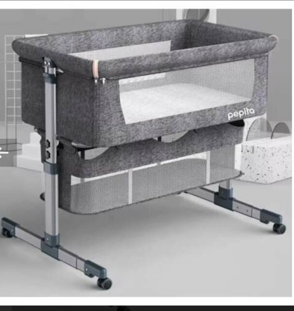 Predám Detskú postieľku Pepita s pripojiteľnou postieľkou s matracom a úložným košom sivá.
